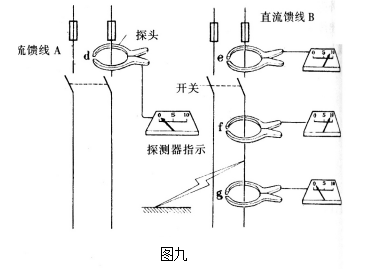 當(dāng)沿故障線路順序查找時(shí),探頭跨過(guò)接地點(diǎn)后,則表頭指示有明顯的減小甚至為“0”,如圖九,就可判斷為接地點(diǎn)在f與g之間。